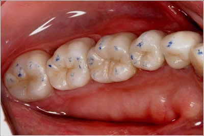 Crayon-like material on a piece of paper, blue on the top, red on the bottom, tells which teeth are hitting where. A basic examination that should be done with anyone whose teeth are cracking or painful. Unfortunately, I don’t think it’s stressed in dental training, because I had to really push one of the doctors to do this test.